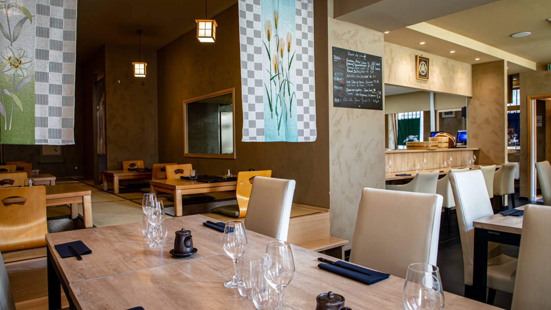 Quatre ambiances pour déguster : Typiquement japonaise, classique européenne, comptoir avec vue sur la cuisine et terrasse.
